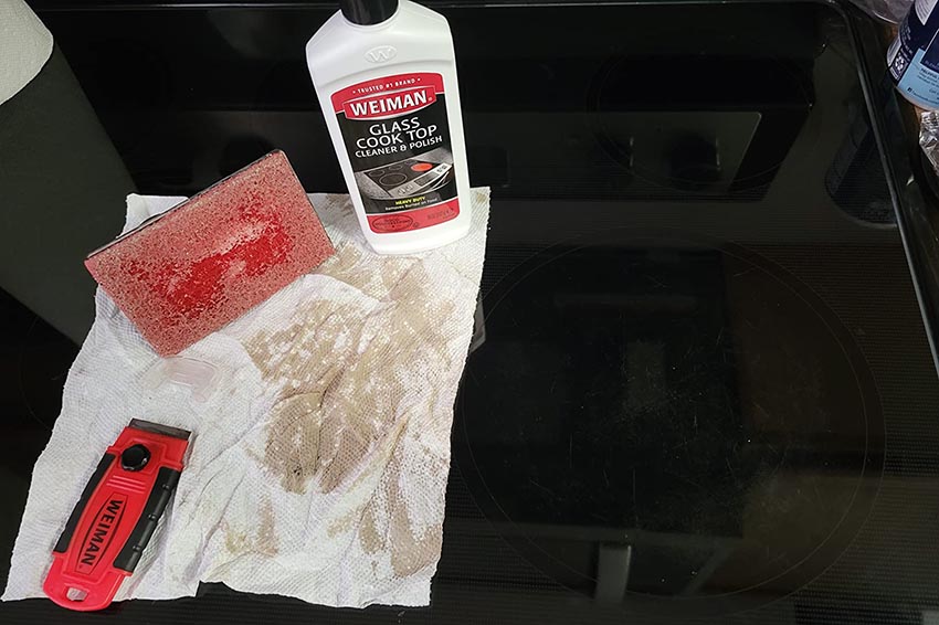 It pairs Weiman’s effective 10-ounce cooktop cream, enhanced with micro-bead technology, with a scrubbing pad and, critically, a razor scraper.
